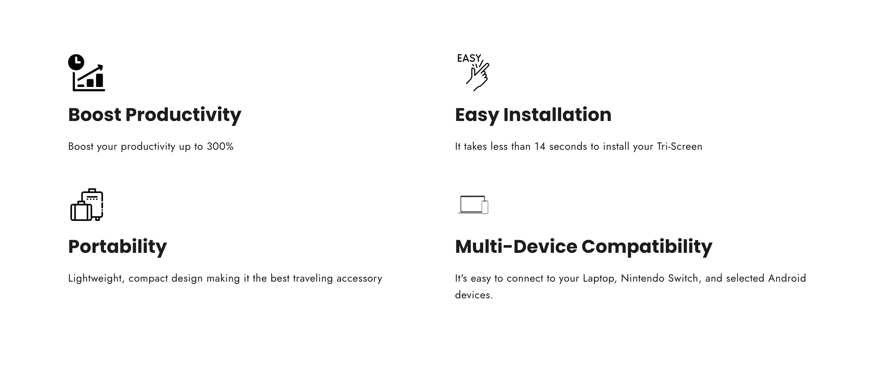 Born to make life simple - plug and play. The Tropire triple-screen portable monitor allows you to handle multi-tasks easily. Improve your work efficiency up to 300% without tabs switching back and forth.